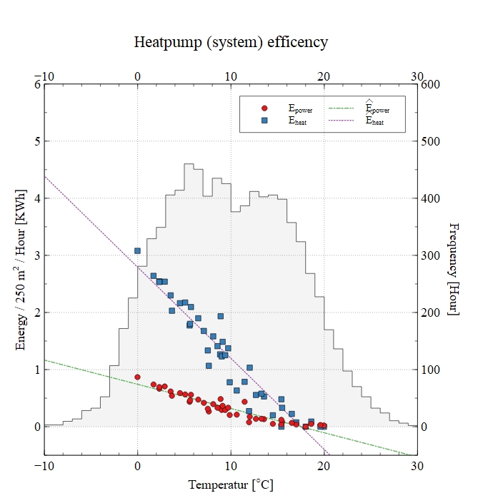 From the heatpump itself information of used and generated energy (kWh) is available. Recording this over time, will – when combined with the average temperature for the specific interval – give us the overlayed scatterplot shown in Figure 3. This plot illustrate the relationship between used and generated (required) energy per square meter per hour at a given temperature, and the average amount of hours per year at a given temperature. The latter will – of course – depend on the region, and hence vary from case to case.
