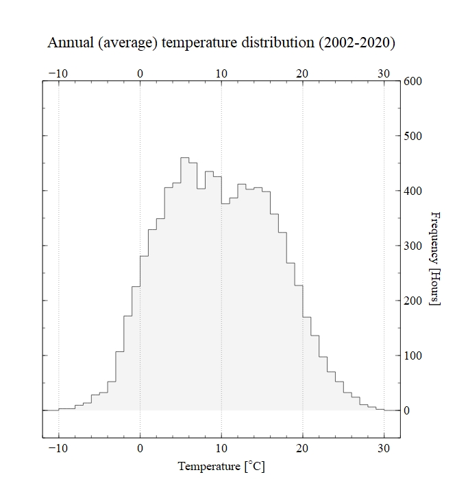 From the database one can make queries returning a JSON format “database”. Several types of meteological data can be acquired, among other temperature (hourly or 10 minute averages). From this one can create the below “frequency” (hourly) distribution. The station chosen started recording data in 2002, more or less continiously, up until this day. Hence the data contain more than 162.000 datapoints. Based on this the average temperature profile in Figure 2 can be found.